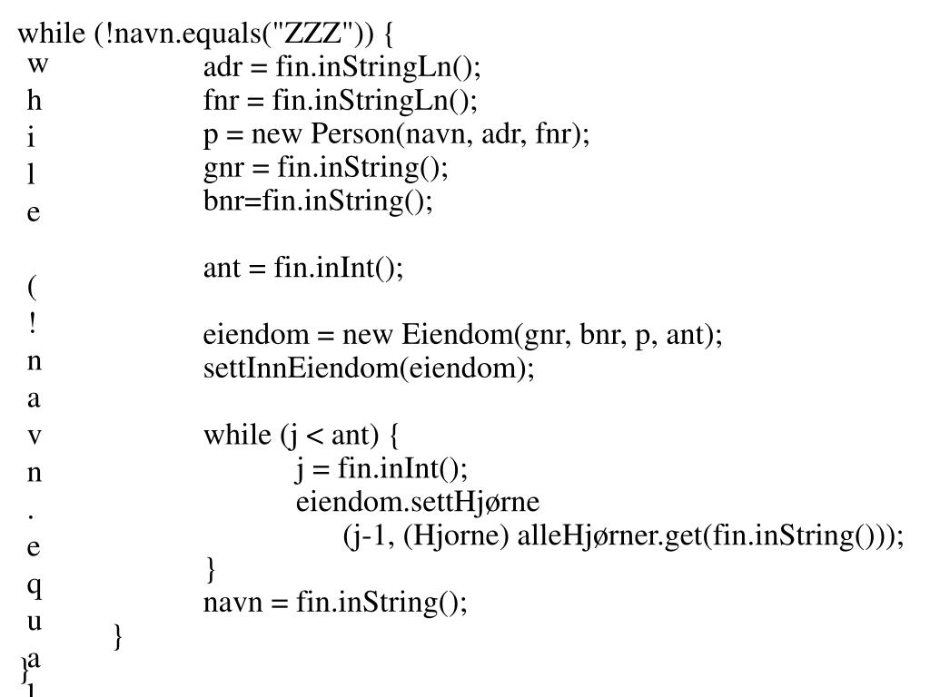 while (!navn.equals("ZZZ")) { adr = fin.inStringLn(); fnr = fin.inStringLn(); p = new Person(navn, adr, fnr); gnr = fin.inString(); bnr=fin.inString(); ant = fin.inInt(); eiendom = new Eiendom(gnr, bnr, p, ant); settInnEiendom(eiendom); while (j < ant) { j = fin.inInt(); eiendom.settHjørne (j-1, (Hjorne) alleHjørner.get(fin.inString())); } navn = fin.inString(); } } while (!navn.equals("ZZZ")) { adr = fin.inStringLn(); fnr = fin.inStringLn(); p = new Person(navn, adr, fnr); gnr = fin.inString(); bnr=fin.inString(); ant = fin.inInt(); eiendom = new Eiendom(gnr, bnr, p, ant); settInnEiendom(eiendom); while (j < ant) { j = fin.inInt(); eiendom.settHjørne(j-1, (Hjorne) alleHjørner.get(fin.inString())); } navn = fin.inString(); } }