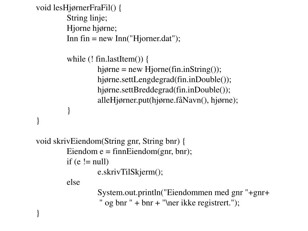 void lesHjørnerFraFil() { String linje; Hjorne hjørne; Inn fin = new Inn("Hjorner.dat"); while (! fin.lastItem()) { hjørne = new Hjorne(fin.inString()); hjørne.settLengdegrad(fin.inDouble()); hjørne.settBreddegrad(fin.inDouble()); alleHjørner.put(hjørne.fåNavn(), hjørne); } } void skrivEiendom(String gnr, String bnr) { Eiendom e = finnEiendom(gnr, bnr); if (e != null) e.skrivTilSkjerm(); else System.out.println("Eiendommen med gnr "+gnr+ " og bnr " + bnr + "\ner ikke registrert."); }