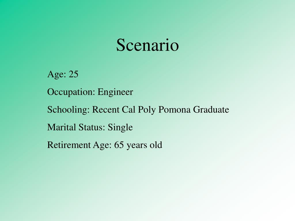 Scenario Age: 25 Occupation: Engineer Schooling: Recent Cal Poly Pomona Graduate Marital Status: Single Retirement Age: 65 years old