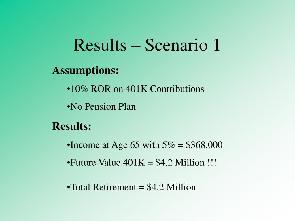 Results – Scenario 1 • Assumptions: • 10% ROR on 401K Contributions • No Pension Plan • Results: • Income at Age 65 with 5% = $368,000 • Future Value 401K = $4.2 Million !!! • Total Retirement = $4.2 Million