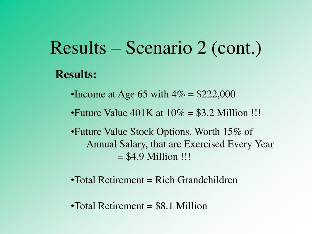 Results – Scenario 2 (cont.) • Results: • Income at Age 65 with 4% = $222,000 • Future Value 401K at 10% = $3.2 Million !!! • Future Value Stock Options, Worth 15% of Annual Salary, that are Exercised Every Year = $4.9 Million !!! • Total Retirement = Rich Grandchildren • Total Retirement = $8.1 Million