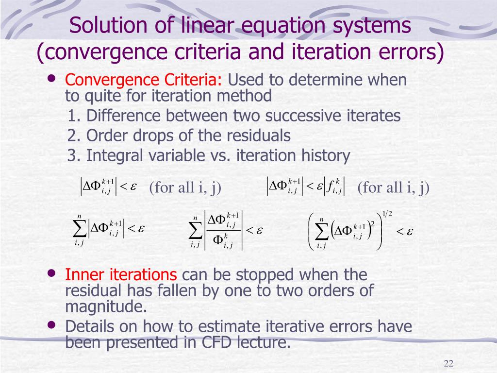 Solution of linear equation systems (convergence criteria and iteration errors) • Convergence Criteria: Used to determine when to quite for iteration method 1. Difference between two successive iterates 2. Order drops of the residuals 3. Integral variable vs. iteration history (for all i, j) (for all i, j) • Inner iterations can be stopped when the residual has fallen by one to two orders of magnitude. • Details on how to estimate iterative errors have been presented in CFD lecture.