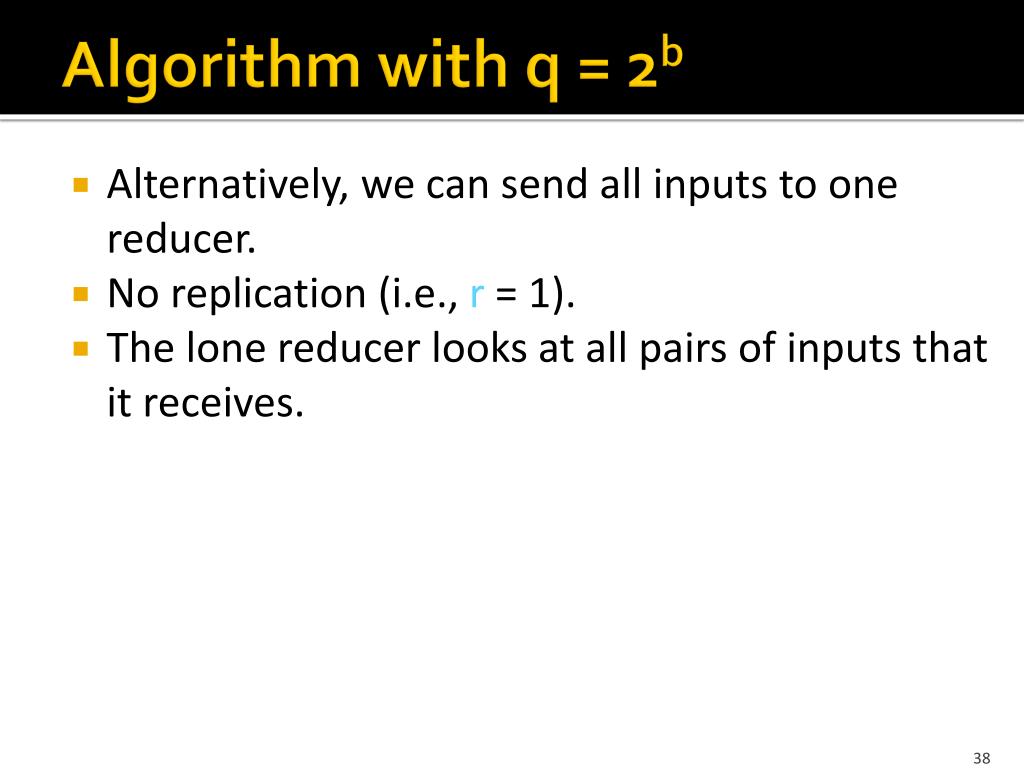 Algorithm with q = 2b • Alternatively, we can send all inputs to one reducer. • No replication (i.e., r = 1). • The lone reducer looks at all pairs of inputs that it receives.