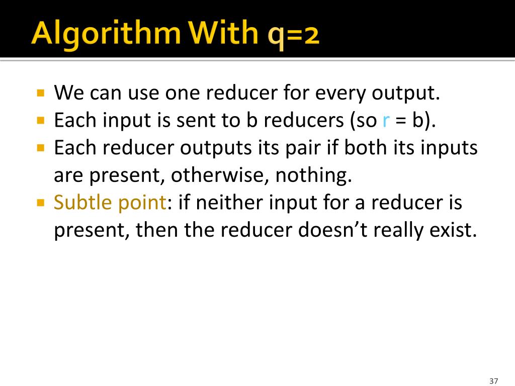 Algorithm With q=2 • We can use one reducer for every output. • Each input is sent to b reducers (so r = b). • Each reducer outputs its pair if both its inputs are present, otherwise, nothing. • Subtle point: if neither input for a reducer is present, then the reducer doesn’t really exist.
