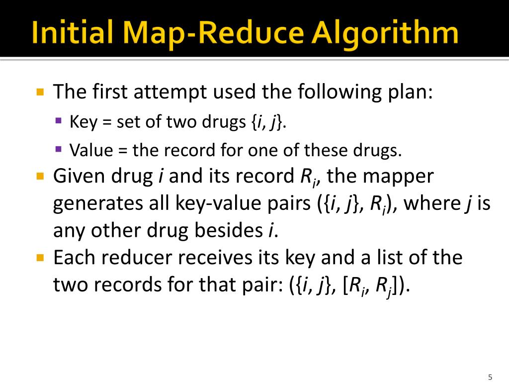 Initial Map-Reduce Algorithm • The first attempt used the following plan: • Key = set of two drugs {i, j}. • Value = the record for one of these drugs. • Given drug i and its record Ri, the mapper generates all key-value pairs ({i, j}, Ri), where j is any other drug besides i. • Each reducer receives its key and a list of the two records for that pair: ({i, j}, [Ri,Rj]).