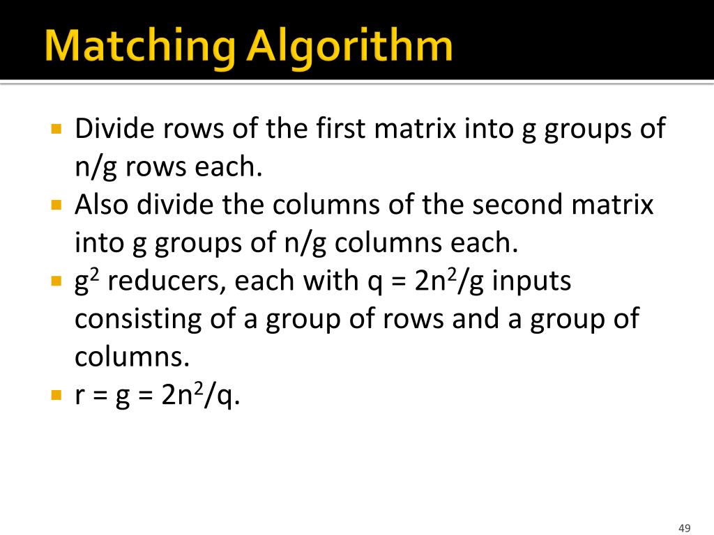 Matching Algorithm • Divide rows of the first matrix into g groups of n/g rows each. • Also divide the columns of the second matrix into g groups of n/g columns each. • g2 reducers, each with q = 2n2/g inputs consisting of a group of rows and a group of columns. • r = g = 2n2/q.