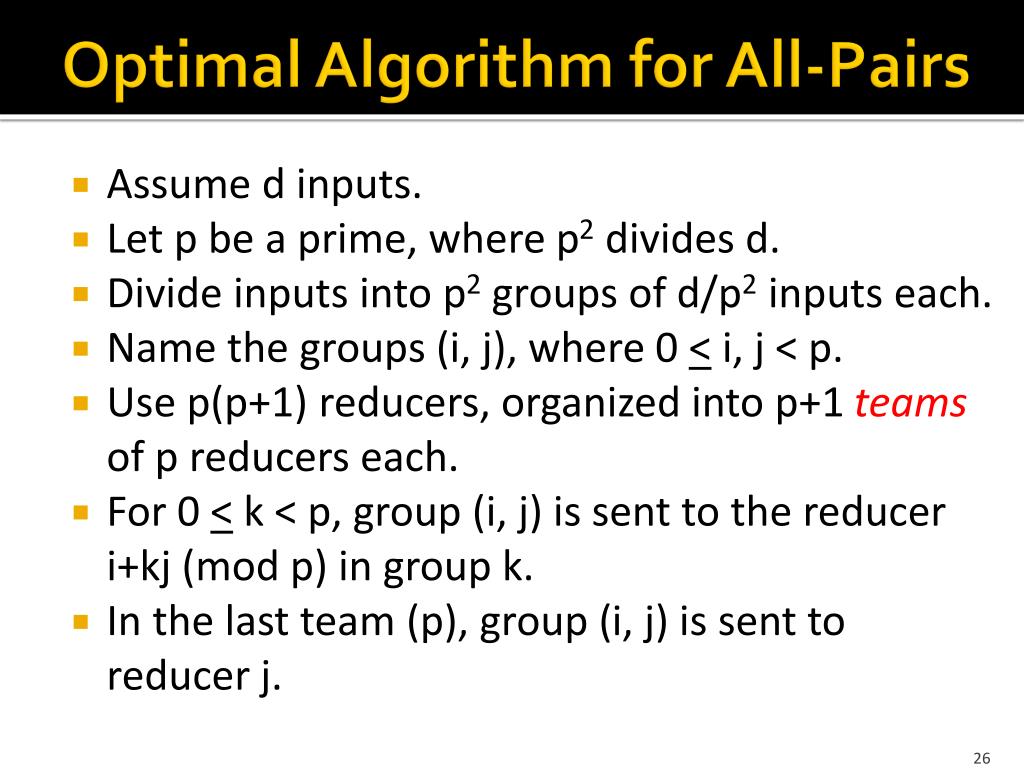 Optimal Algorithm for All-Pairs • Assume d inputs. • Let p be a prime, where p2 divides d. • Divide inputs into p2 groups of d/p2 inputs each. • Name the groups (i, j), where 0 <i, j < p. • Use p(p+1) reducers, organized into p+1 teams of p reducers each. • For 0 < k < p, group (i, j) is sent to the reducer i+kj (mod p) in group k. • In the last team (p), group (i, j) is sent to reducer j.