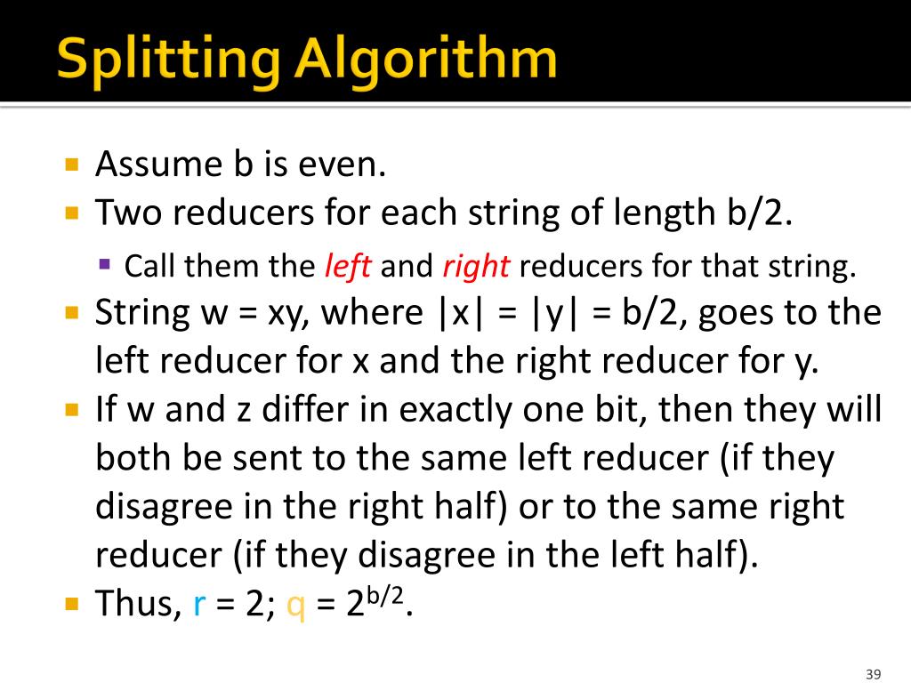 Splitting Algorithm • Assume b is even. • Two reducers for each string of length b/2. • Call them the left and right reducers for that string. • String w = xy, where |x| = |y| = b/2, goes to the left reducer for x and the right reducer for y. • If w and z differ in exactly one bit, then they will both be sent to the same left reducer (if they disagree in the right half) or to the same right reducer (if they disagree in the left half). • Thus, r = 2; q = 2b/2.