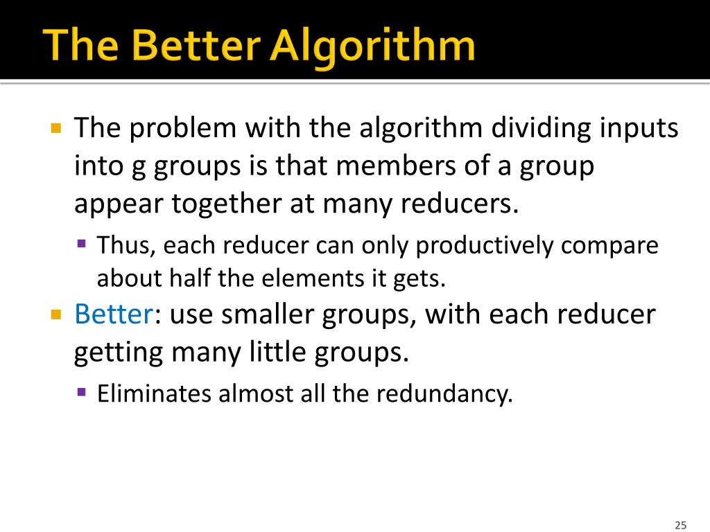 The Better Algorithm • The problem with the algorithm dividing inputs into g groups is that members of a group appear together at many reducers. • Thus, each reducer can only productively compare about half the elements it gets. • Better: use smaller groups, with each reducer getting many little groups. • Eliminates almost all the redundancy.