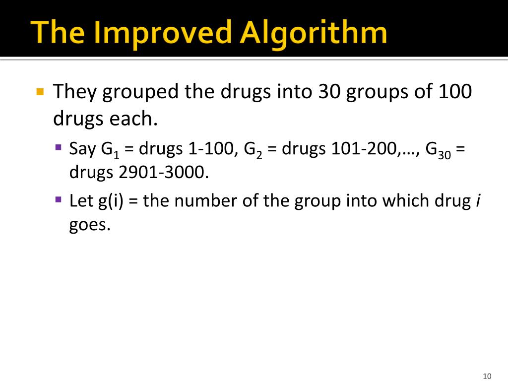 The Improved Algorithm • They grouped the drugs into 30 groups of 100 drugs each. • Say G1 = drugs 1-100, G2 = drugs 101-200,…, G30 = drugs 2901-3000. • Let g(i) = the number of the group into which drug i goes.