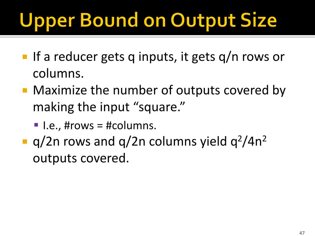 Upper Bound on Output Size • If a reducer gets q inputs, it gets q/n rows or columns. • Maximize the number of outputs covered by making the input “square.” • I.e., #rows = #columns. • q/2n rows and q/2n columns yield q2/4n2 outputs covered.