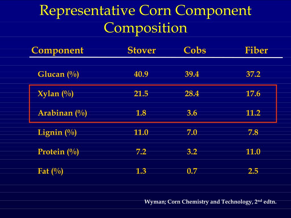Representative Corn Component Composition Component Stover Cobs Fiber Glucan (%) Xylan (%) Arabinan (%) Lignin (%) Protein (%) Fat (%) 40.9 21.5 1.8 11.0 7.2 1.3 39.4 28.4 3.6 7.0 3.2 0.7 37.2 17.6 11.2 7.8 11.0 2.5 Wyman; Corn Chemistry and Technology, 2nd edtn.