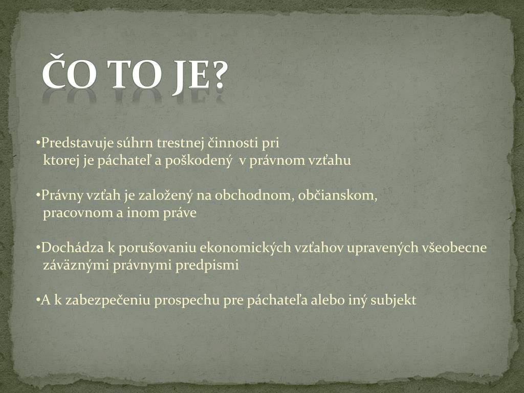 Čo to je? • Predstavuje súhrntrestnejčinnosti pri • ktorej je páchateľ a poškodený v právnom vzťahu • Právny vzťah je založený na obchodnom, občianskom, • pracovnom a inom práve • Dochádza k porušovaniu ekonomických vzťahov upravených všeobecne • záväznými právnymi predpismi • A k zabezpečeniu prospechu pre páchateľa alebo iný subjekt