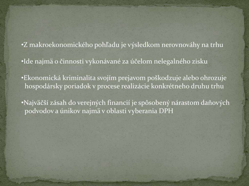Z makroekonomického pohľadu je výsledkom nerovnováhy na trhu • Ide najmä o činnosti vykonávané za účelom nelegalného zisku • Ekonomická kriminalita svojímprejavompoškodzujealeboohrozuje • hospodárskyporiadok v proceserealizáciekonkrétnehodruhutrhu • Najväčšízásah do verejnýchfinancií je spôsobenýnárastomdaňových • podvodova únikovnajmä v oblastivyberania DPH
