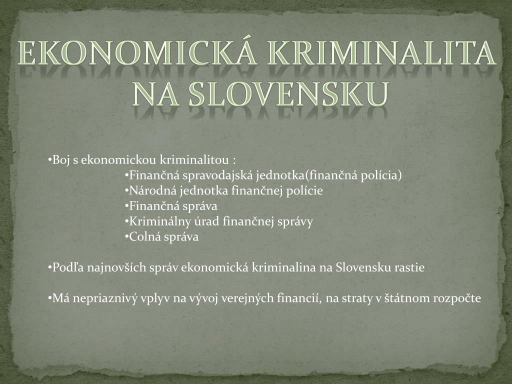 EKONOMICKÁ Kriminalita na SLOVENSKU • Boj s ekonomickou kriminalitou : • Finančná spravodajská jednotka(finančná polícia) • Národná jednotka finančnej polície • Finančná správa • Kriminálny úrad finančnej správy • Colná správa • Podľa najnovších správ ekonomická kriminalina na Slovensku rastie • Má nepriaznivývplyvnavývojverejnýchfinancií, nastraty v štátnomrozpočte
