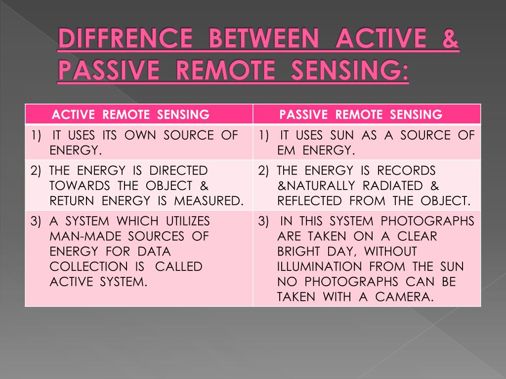 CLASSIFICATION OF REMOTE SENSING. • REMOTE SENSING IS BROADLY CLASSIFIED INTO TWO CATEGORIES. CLASSIFICATION ACTIVE PASSIVE