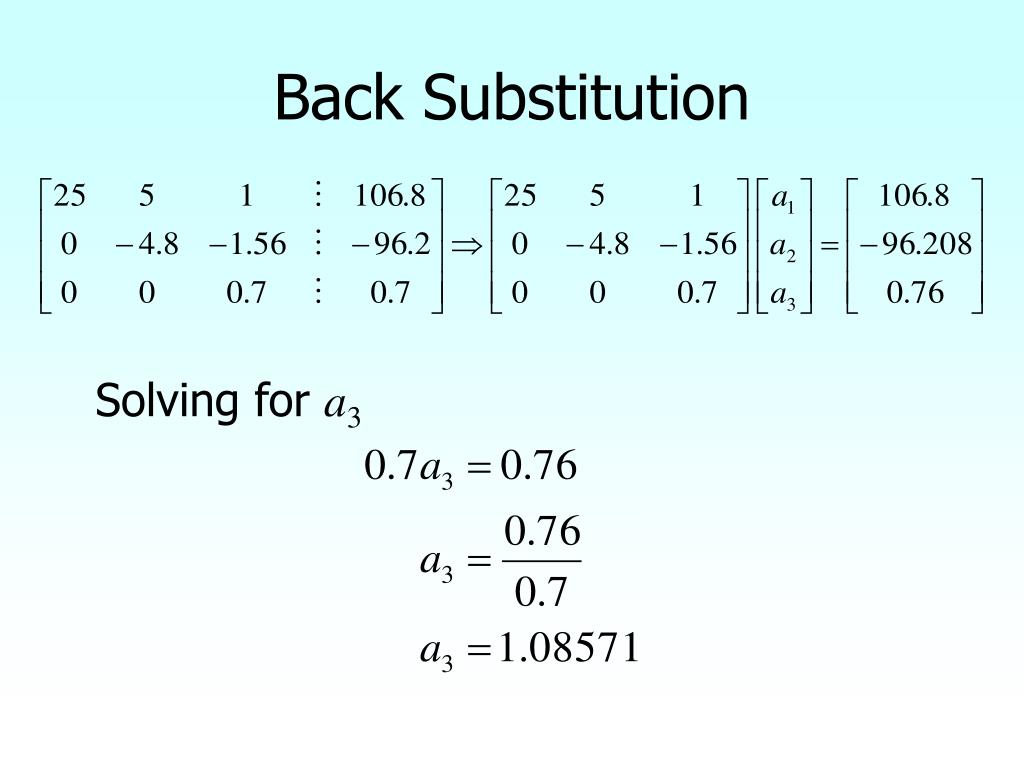 Back Substitution Solve each equation starting from the last equation Example of a system of 3 equations