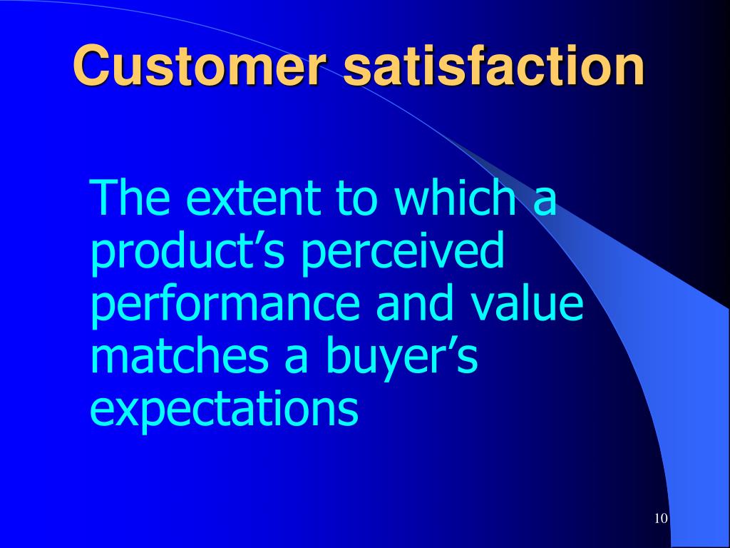 Customer satisfaction The extent to which a product’s perceived performance and value matches a buyer’s expectations