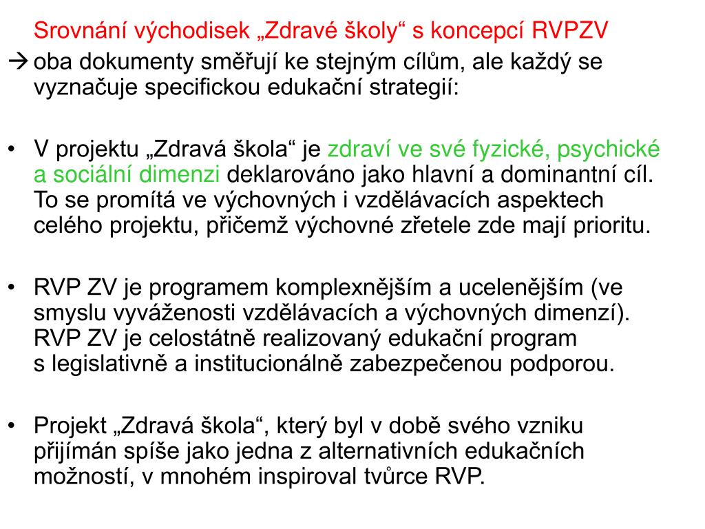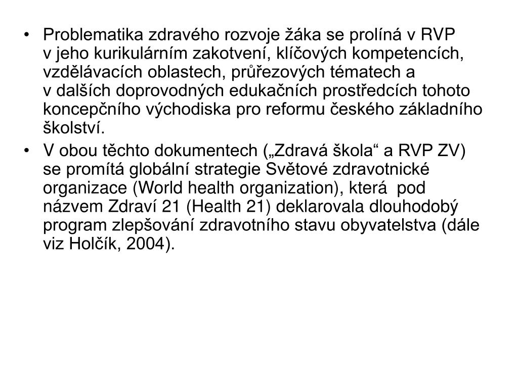 Problematika zdravého rozvoje žáka se prolíná v RVP v jeho kurikulárním zakotvení, klíčových kompetencích, vzdělávacích oblastech, průřezových tématech a v dalších doprovodných edukačních prostředcích tohoto koncepčního východiska pro reformu českého základního školství. • V obou těchto dokumentech („Zdravá škola“ a RVP ZV) se promítá globální strategie Světové zdravotnické organizace (World health organization), která pod názvem Zdraví 21 (Health 21) deklarovala dlouhodobý program zlepšování zdravotního stavu obyvatelstva (dále viz Holčík, 2004).