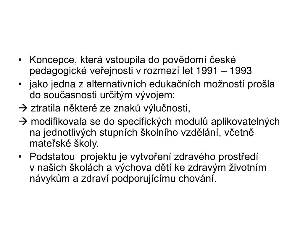 Koncepce, která vstoupila do povědomí české pedagogické veřejnosti v rozmezí let 1991 – 1993 • jako jedna z alternativních edukačních možností prošla do současnosti určitým vývojem: ztratila některé ze znaků výlučnosti, modifikovala se do specifických modulů aplikovatelných na jednotlivých stupních školního vzdělání, včetně mateřské školy. • Podstatou projektu je vytvoření zdravého prostředí v našich školách a výchova dětí ke zdravým životním návykům a zdraví podporujícímu chování.