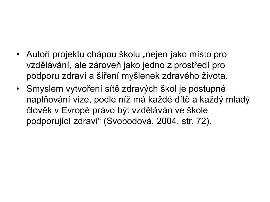 Autoři projektu chápou školu „nejen jako místo pro vzdělávání, ale zároveň jako jedno z prostředí pro podporu zdraví a šíření myšlenek zdravého života. • Smyslem vytvoření sítě zdravých škol je postupné naplňování vize, podle níž má každé dítě a každý mladý člověk v Evropě právo být vzděláván ve škole podporující zdraví“ (Svobodová, 2004, str. 72).