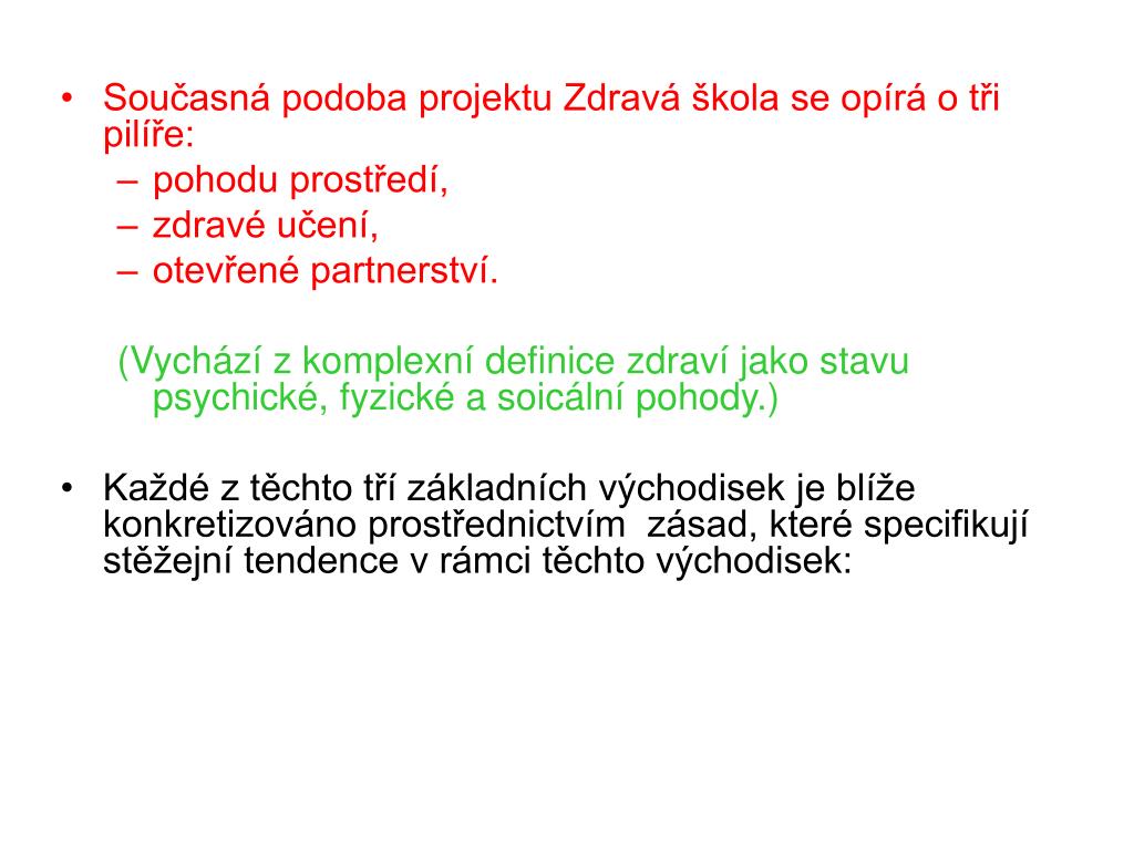 Současná podoba projektu Zdravá škola se opírá o tři pilíře: • pohodu prostředí, • zdravé učení, • otevřené partnerství. (Vychází z komplexní definice zdraví jako stavu psychické, fyzické a soicální pohody.) • Každé z těchto tří základních východisek je blíže konkretizováno prostřednictvím zásad, které specifikují stěžejní tendence v rámci těchto východisek: