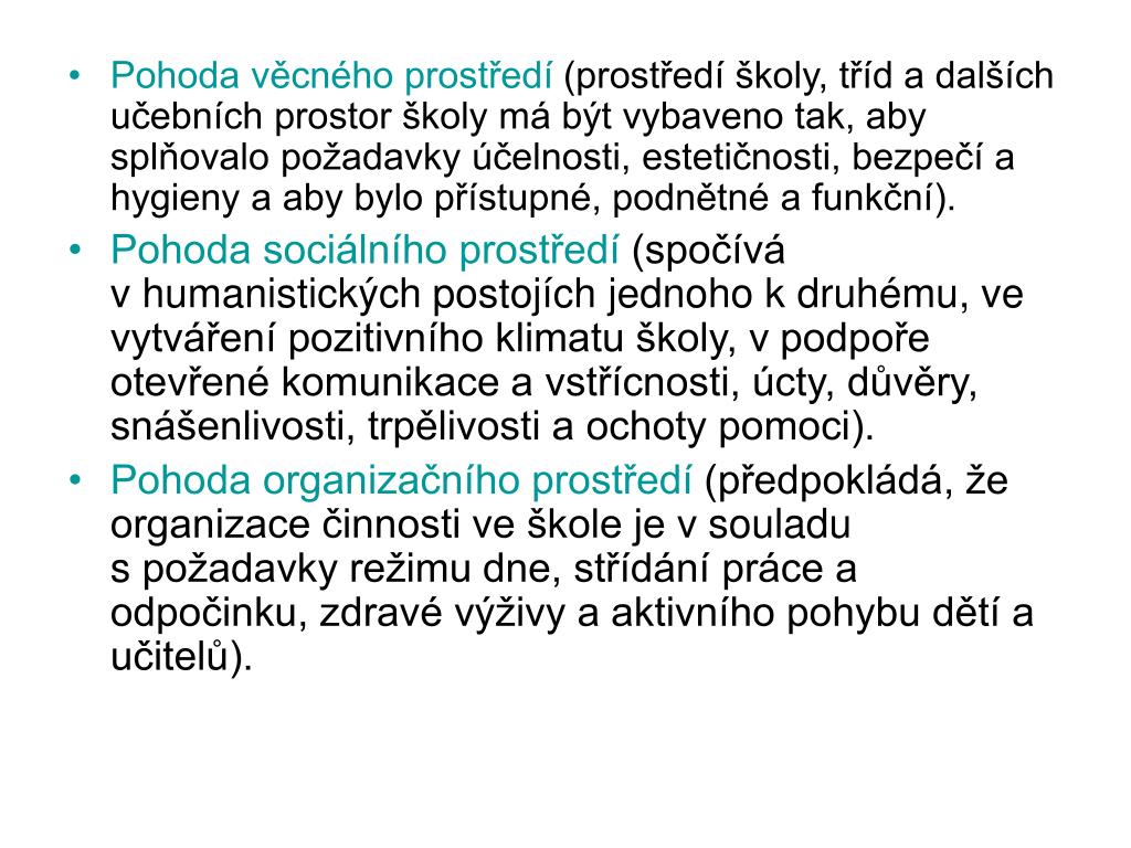 Pohoda věcného prostředí (prostředí školy, tříd a dalších učebních prostor školy má být vybaveno tak, aby splňovalo požadavky účelnosti, estetičnosti, bezpečí a hygieny a aby bylo přístupné, podnětné a funkční). • Pohoda sociálního prostředí (spočívá v humanistických postojích jednoho k druhému, ve vytváření pozitivního klimatu školy, v podpoře otevřené komunikace a vstřícnosti, úcty, důvěry, snášenlivosti, trpělivosti a ochoty pomoci). • Pohoda organizačního prostředí (předpokládá, že organizace činnosti ve škole je v souladu s požadavky režimu dne, střídání práce a odpočinku, zdravé výživy a aktivního pohybu dětí a učitelů).