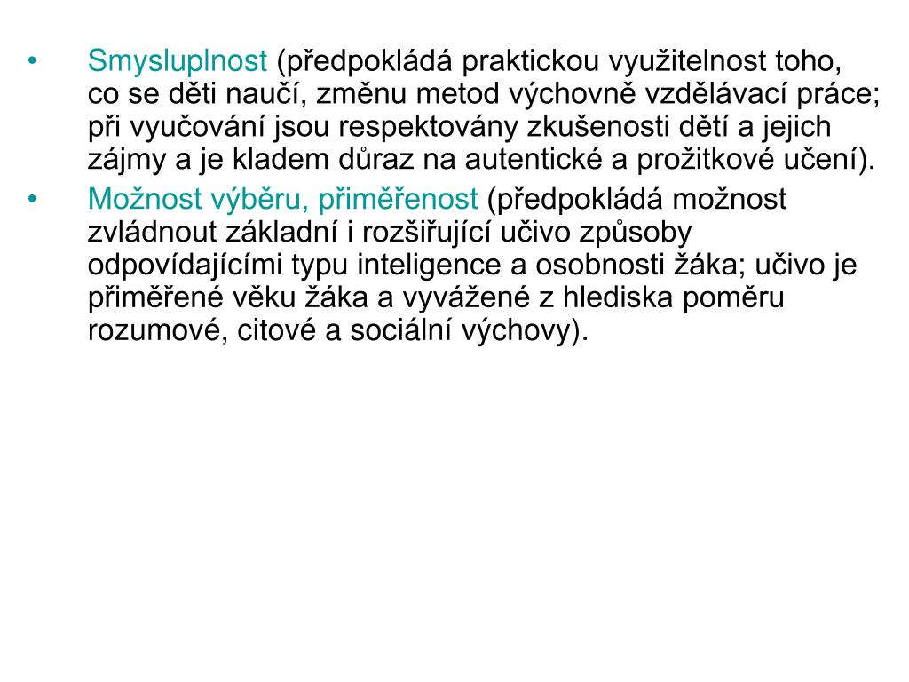 Smysluplnost (předpokládá praktickou využitelnost toho, co se děti naučí, změnu metod výchovně vzdělávací práce; při vyučování jsou respektovány zkušenosti dětí a jejich zájmy a je kladem důraz na autentické a prožitkové učení). • Možnost výběru, přiměřenost (předpokládá možnost zvládnout základní i rozšiřující učivo způsoby odpovídajícími typu inteligence a osobnosti žáka; učivo je přiměřené věku žáka a vyvážené z hlediska poměru rozumové, citové a sociální výchovy).