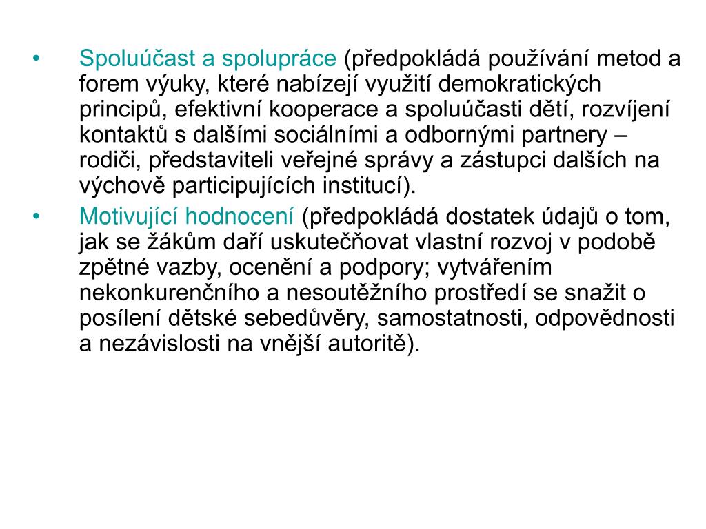 Spoluúčast a spolupráce (předpokládá používání metod a forem výuky, které nabízejí využití demokratických principů, efektivní kooperace a spoluúčasti dětí, rozvíjení kontaktů s dalšími sociálními a odbornými partnery – rodiči, představiteli veřejné správy a zástupci dalších na výchově participujících institucí). • Motivující hodnocení (předpokládá dostatek údajů o tom, jak se žákům daří uskutečňovat vlastní rozvoj v podobě zpětné vazby, ocenění a podpory; vytvářením nekonkurenčního a nesoutěžního prostředí se snažit o posílení dětské sebedůvěry, samostatnosti, odpovědnosti a nezávislosti na vnější autoritě).