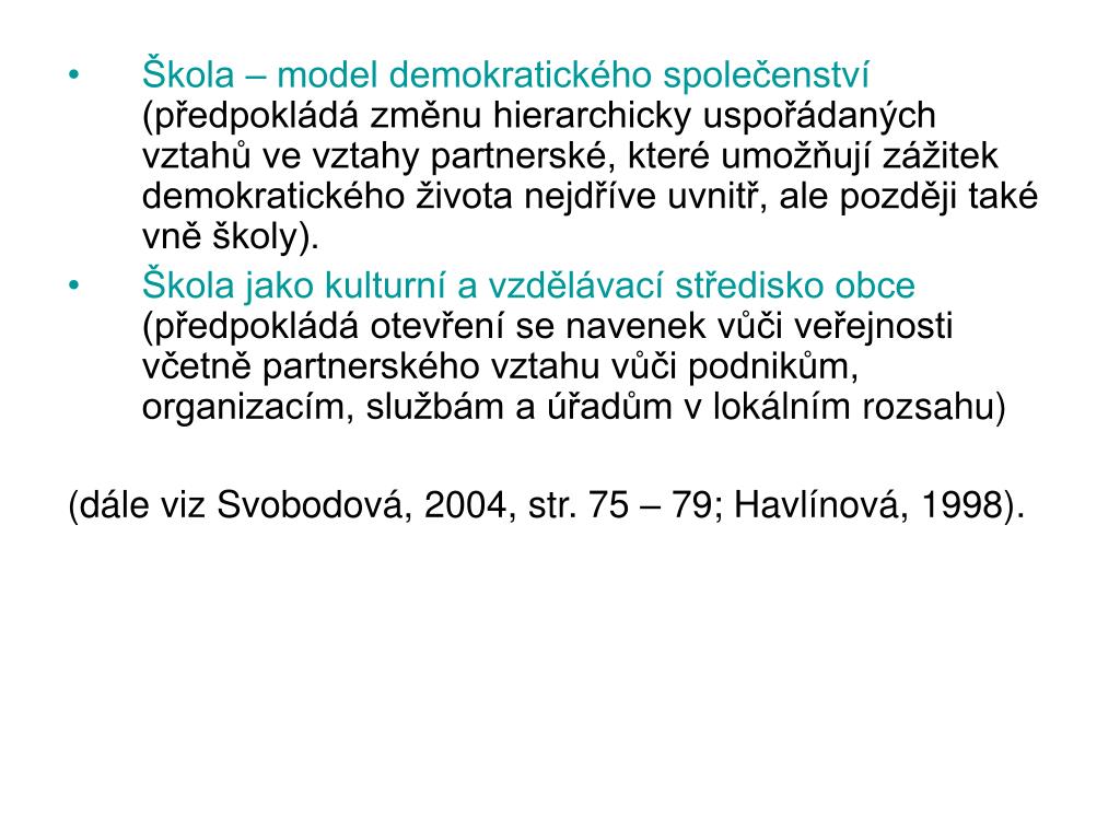 Škola – model demokratického společenství (předpokládá změnu hierarchicky uspořádaných vztahů ve vztahy partnerské, které umožňují zážitek demokratického života nejdříve uvnitř, ale později také vně školy). • Škola jako kulturní a vzdělávací středisko obce (předpokládá otevření se navenek vůči veřejnosti včetně partnerského vztahu vůči podnikům, organizacím, službám a úřadům v lokálním rozsahu) (dále viz Svobodová, 2004, str. 75 – 79; Havlínová, 1998).