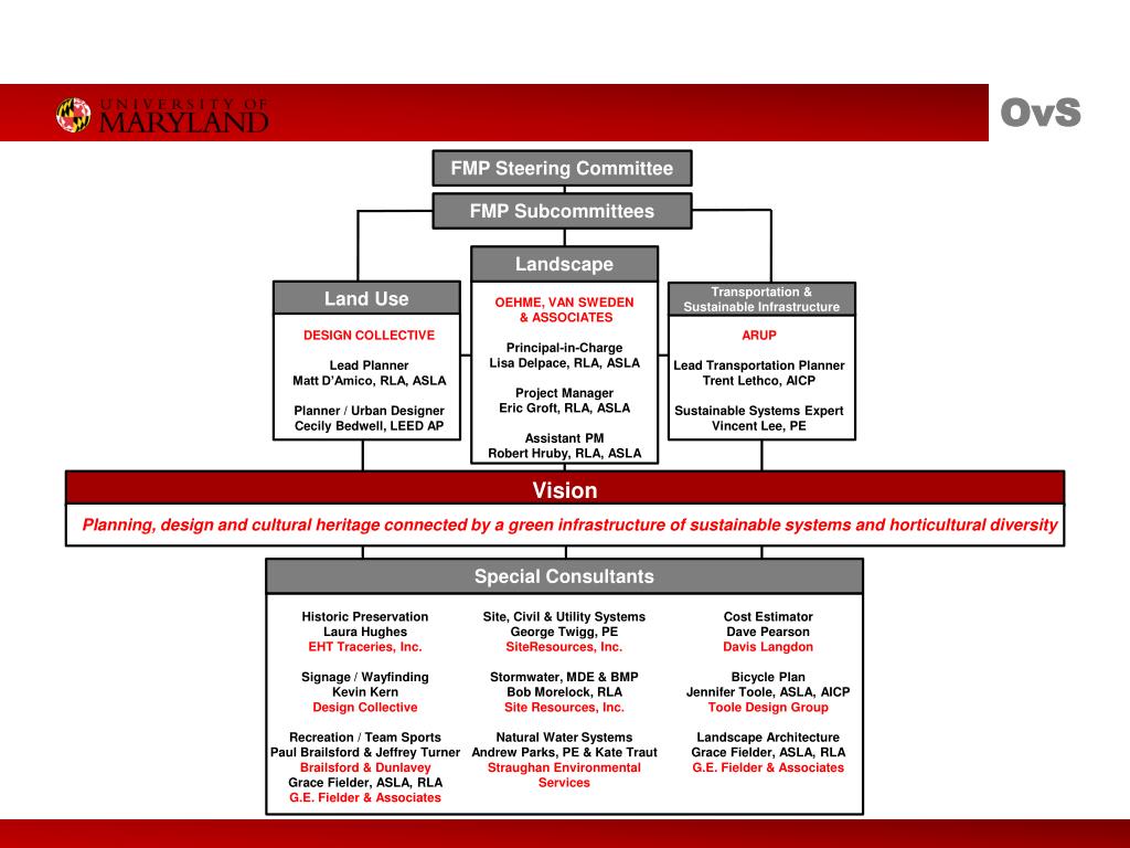 OvS FMP Steering Committee FMP Subcommittees Landscape Land Use Transportation & Sustainable Infrastructure OEHME, VAN SWEDEN & ASSOCIATES Principal-in-Charge Lisa Delpace, RLA, ASLA Project Manager Eric Groft, RLA, ASLA Assistant PM Robert Hruby, RLA, ASLA DESIGN COLLECTIVE Lead Planner Matt D’Amico, RLA, ASLA Planner / Urban Designer Cecily Bedwell, LEED AP ARUP Lead Transportation Planner Trent Lethco, AICP Sustainable Systems Expert Vincent Lee, PE Vision Planning, design and cultural heritage connected by a green infrastructure of sustainable systems and horticultural diversity Special Consultants Historic Preservation Laura Hughes EHT Traceries, Inc. Signage / Wayfinding Kevin Kern Design Collective Recreation / Team Sports Paul Brailsford & Jeffrey Turner Brailsford & Dunlavey Grace Fielder, ASLA, RLA G.E. Fielder & Associates Site, Civil & Utility Systems George Twigg, PE SiteResources, Inc. Stormwater, MDE & BMP Bob Morelock, RLA Site Resources, Inc. Natural Water Systems Andrew Parks, PE & Kate Traut Straughan Environmental Services Cost Estimator Dave Pearson Davis Langdon Bicycle Plan Jennifer Toole, ASLA, AICP Toole Design Group Landscape Architecture Grace Fielder, ASLA, RLA G.E. Fielder & Associates