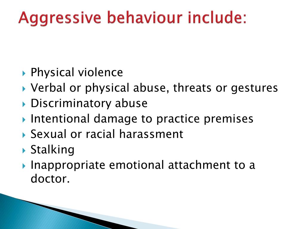 Aggressive behaviour include: • Physical violence • Verbal or physical abuse, threats or gestures • Discriminatory abuse • Intentional damage to practice premises • Sexual or racial harassment • Stalking • Inappropriate emotional attachment to a doctor.