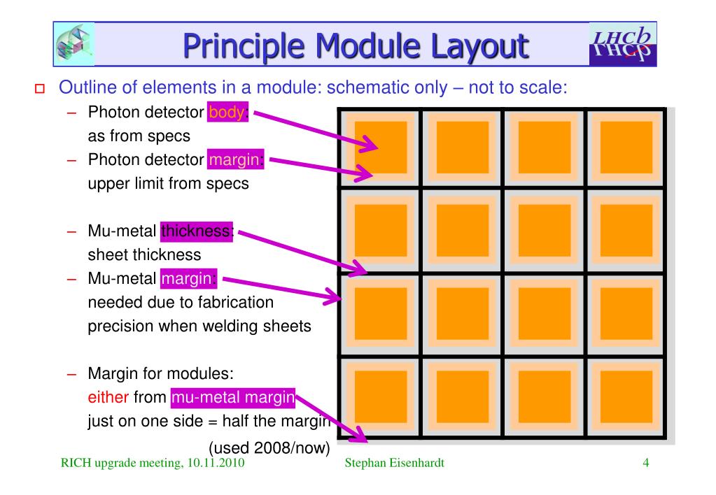 Principle Module Layout • Outline of elements in a module: schematic only – not to scale: • Photon detector body: as from specs • Photon detector margin: upper limit from specs • Mu-metal thickness: sheet thickness • Mu-metal margin: needed due to fabrication precision when welding sheets • Margin for modules: or as extra margin (used in 2000 proposal) Stephan Eisenhardt