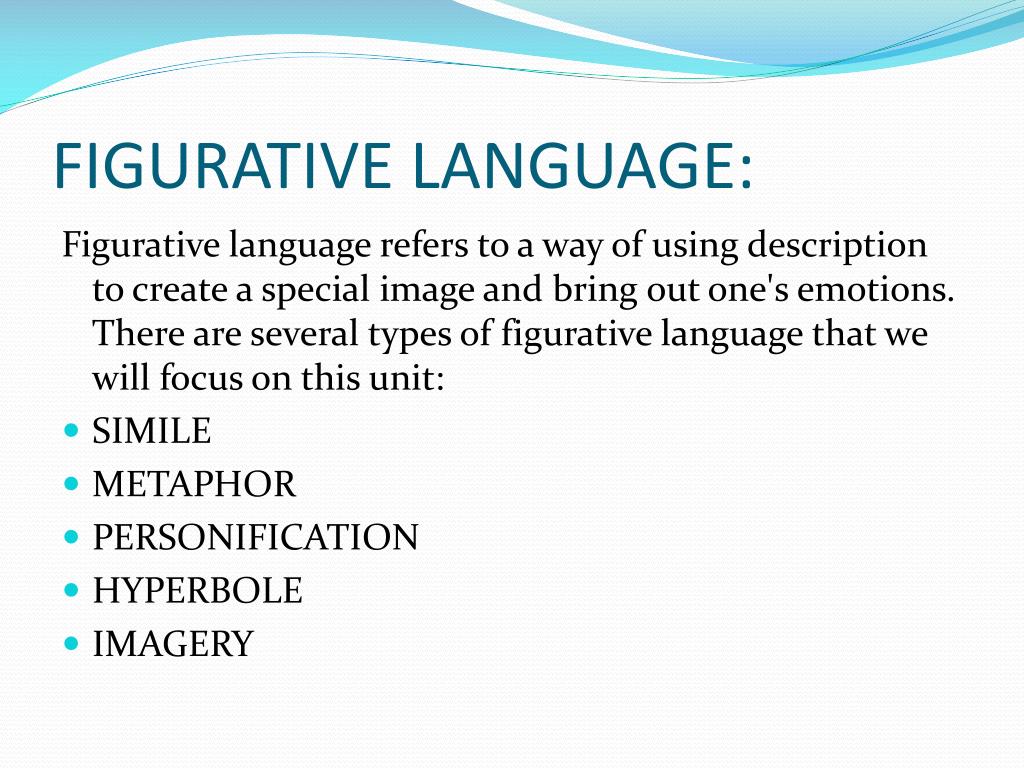 FIGURATIVE LANGUAGE: Figurative language refers to a way of using description to create a special image and bring out one's emotions. There are several types of figurative language that we will focus on this unit: • SIMILE • METAPHOR • PERSONIFICATION • HYPERBOLE • IMAGERY