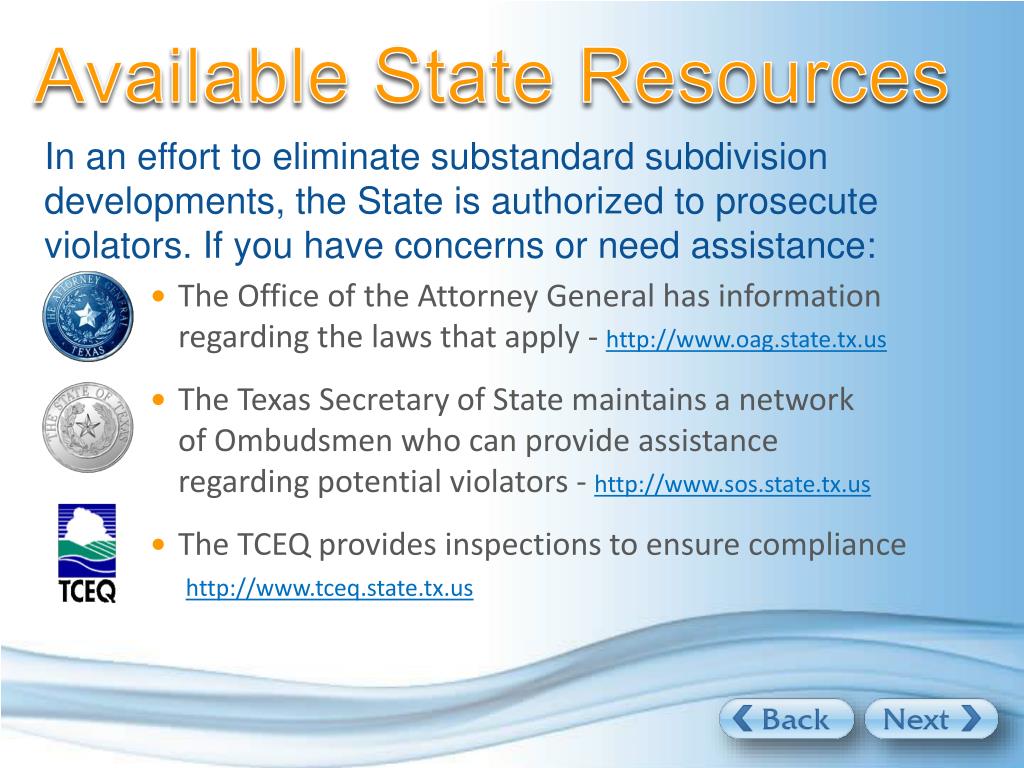 Available State Resources In an effort to eliminate substandard subdivision developments, the State is authorized to prosecute violators. If you have concerns or need assistance: • The Office of the Attorney General has information regarding the laws that apply - http://www.oag.state.tx.us • The Texas Secretary of State maintains a network of Ombudsmen who can provide assistance regarding potential violators - http://www.sos.state.tx.us • The TCEQ provides inspections to ensure compliancehttp://www.tceq.state.tx.us