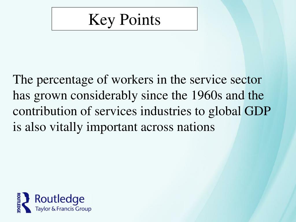 Key Points • The percentage of workers in the service sector has grown considerably since the 1960s and the contribution of services industries to global GDP is also vitally important across nations