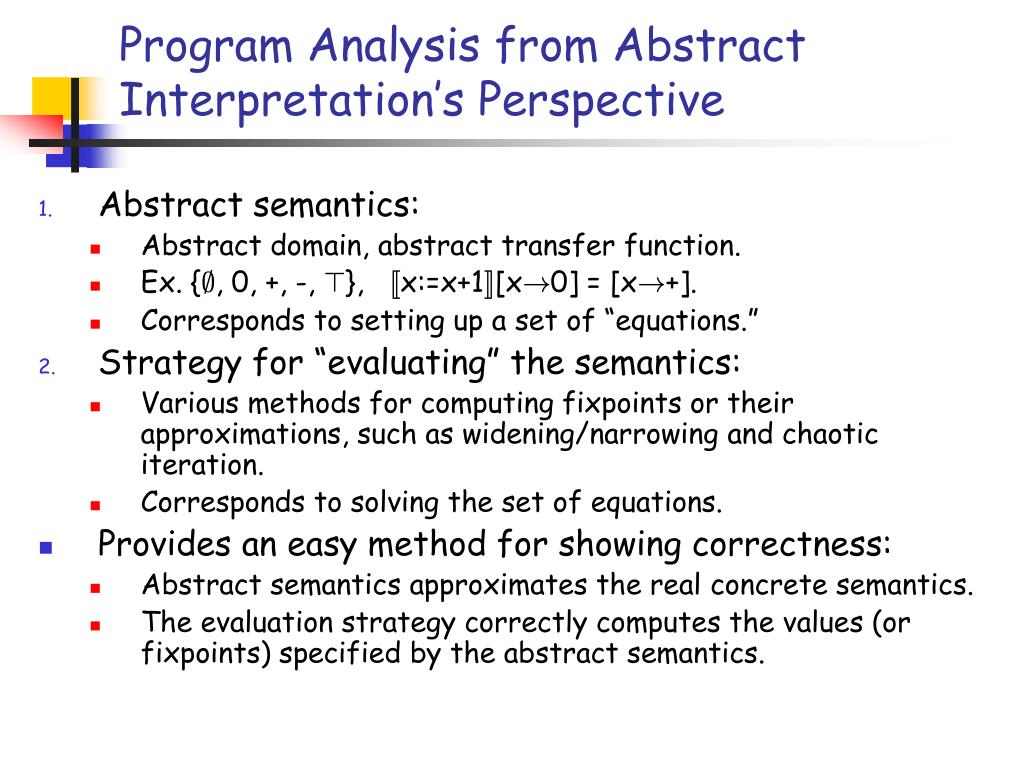 Program Analysis from Abstract Interpretation’s Perspective • Abstract semantics: • Abstract domain, abstract transfer function. • Ex. {;, 0, +, -, >}, «x:=x+1¬[x!0] = [x!+]. • Corresponds to setting up a set of “equations.” • Strategy for “evaluating” the semantics: • Various methods for computing fixpoints or their approximations, such as widening/narrowing and chaotic iteration. • Corresponds to solving the set of equations. • Provides an easy method for showing correctness: • Abstract semantics approximates the real concrete semantics. • The evaluation strategy correctly computes the values (or fixpoints) specified by the abstract semantics.