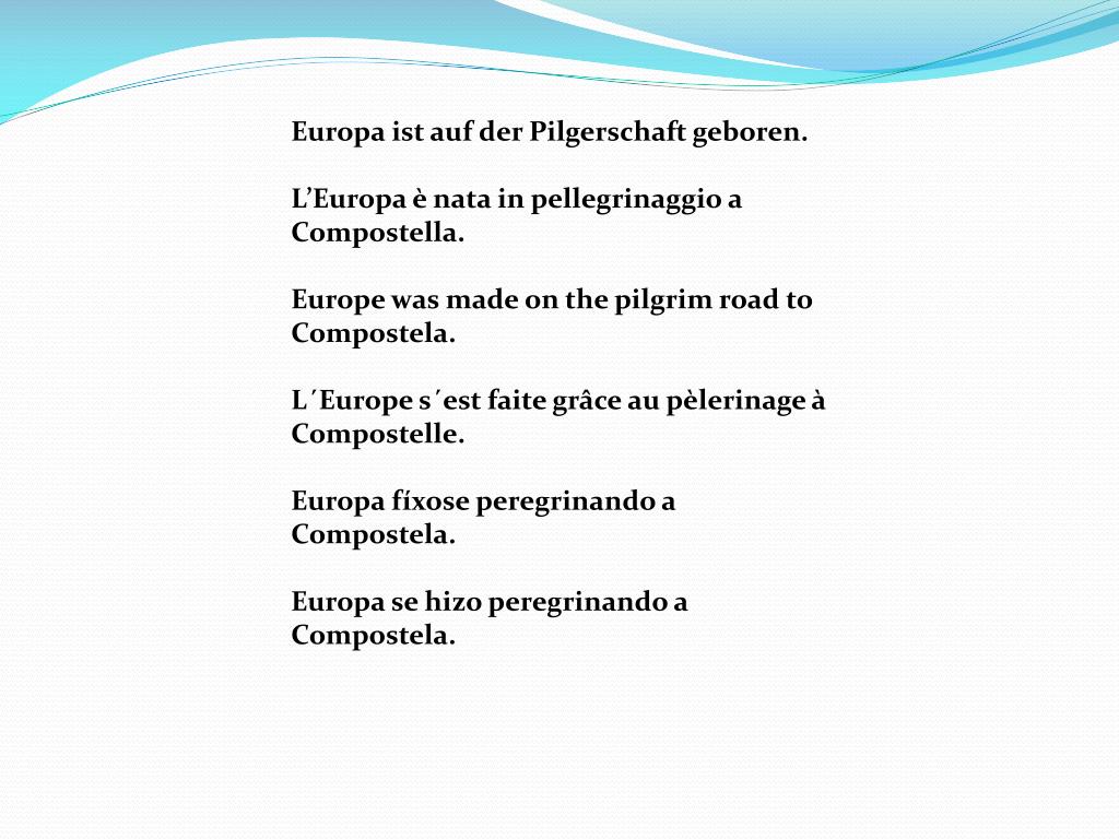 Europa istaufderPilgerschaftgeboren.L’Europa è nata in pellegrinaggio a Compostella.Europewasmadeon the pilgrimroad to Compostela.L´Europes´estfaitegrâceaupèlerinage à Compostelle.Europa fíxose peregrinando a Compostela.Europa se hizo peregrinando a Compostela.