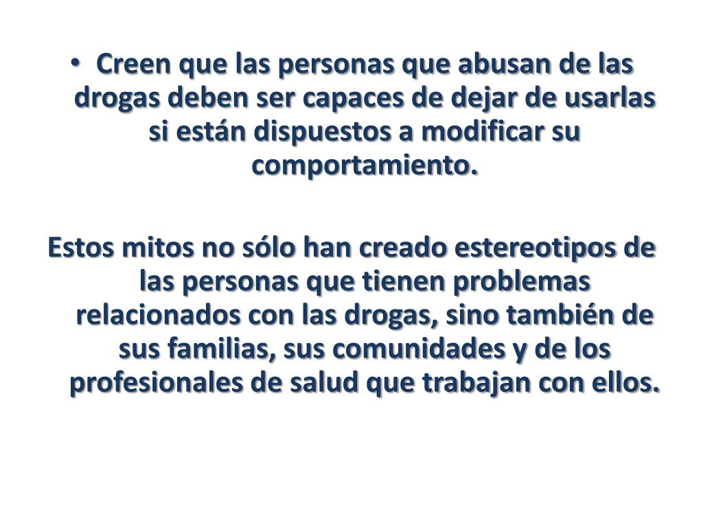 Creen que las personas que abusan de las drogas deben ser capaces de dejar de usarlas si están dispuestos a modificar su comportamiento. Estos mitos no sólo han creado estereotipos de las personas que tienen problemas relacionados con las drogas, sino también de sus familias, sus comunidades y de los profesionales de salud que trabajan con ellos.