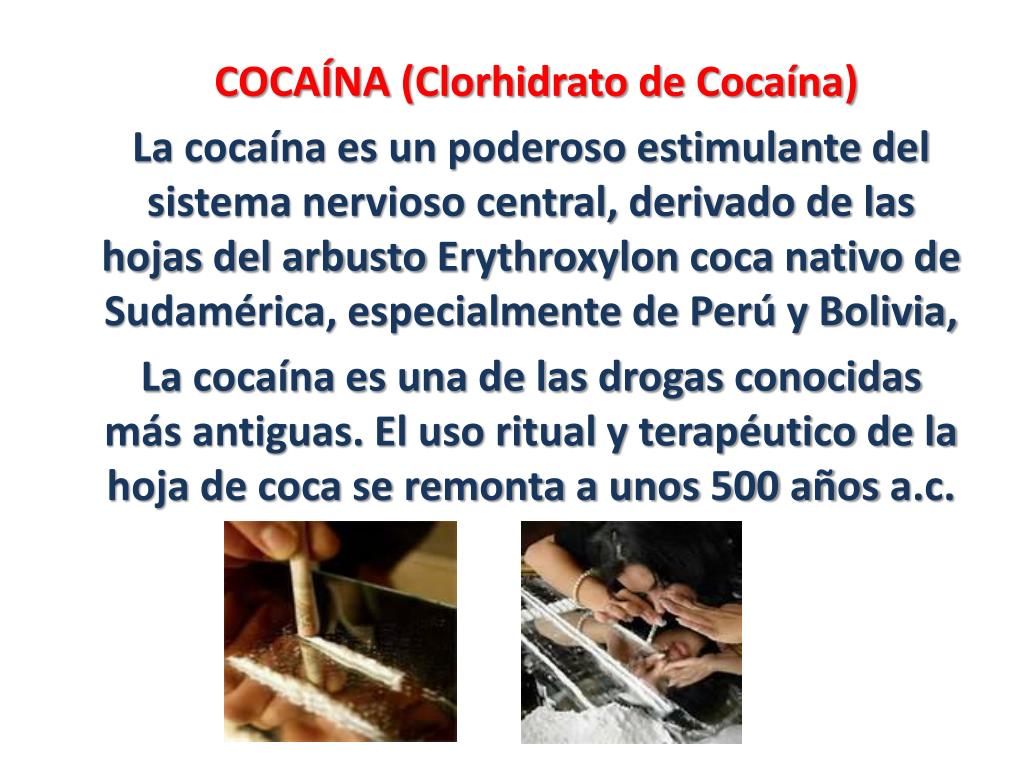 COCAÍNA (Clorhidrato de Cocaína) La cocaína es un poderoso estimulante del sistema nervioso central, derivado de las hojas del arbusto Erythroxylon coca nativo de Sudamérica, especialmente de Perú y Bolivia, La cocaína es una de las drogas conocidas más antiguas. El uso ritual y terapéutico de la hoja de coca se remonta a unos 500 años a.c.