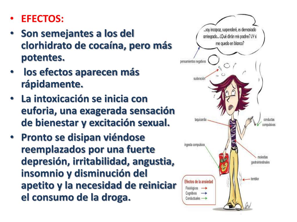 EFECTOS: • Son semejantes a los del clorhidrato de cocaína, pero más potentes. • los efectos aparecen más rápidamente. • La intoxicación se inicia con euforia, una exagerada sensación de bienestar y excitación sexual. • Pronto se disipan viéndose reemplazados por una fuerte depresión, irritabilidad, angustia, insomnio y disminución del apetito y la necesidad de reiniciar el consumo de la droga.