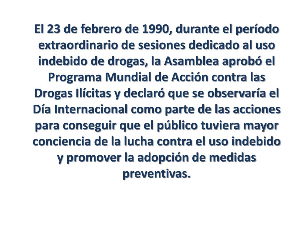 El 23 de febrero de 1990, durante el período extraordinario de sesiones dedicado al uso indebido de drogas, la Asamblea aprobó el Programa Mundial de Acción contra las Drogas Ilícitas y declaró que se observaría el Día Internacional como parte de las acciones para conseguir que el público tuviera mayor conciencia de la lucha contra el uso indebido y promover la adopción de medidas preventivas.