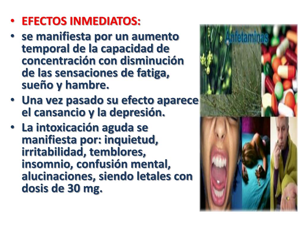 EFECTOS INMEDIATOS: • se manifiesta por un aumento temporal de la capacidad de concentración con disminución de las sensaciones de fatiga, sueño y hambre. • Una vez pasado su efecto aparece el cansancio y la depresión. • La intoxicación aguda se manifiesta por: inquietud, irritabilidad, temblores, insomnio, confusión mental, alucinaciones, siendo letales con dosis de 30 mg.
