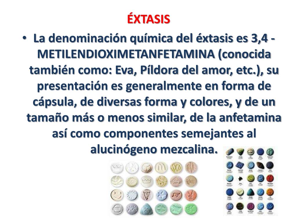 ÉXTASIS • La denominación química del éxtasis es 3,4 -METILENDIOXIMETANFETAMINA (conocida también como: Eva, Píldora del amor, etc.), su presentación es generalmente en forma de cápsula, de diversas forma y colores, y de un tamaño más o menos similar, de la anfetamina así como componentes semejantes al alucinógeno mezcalina.