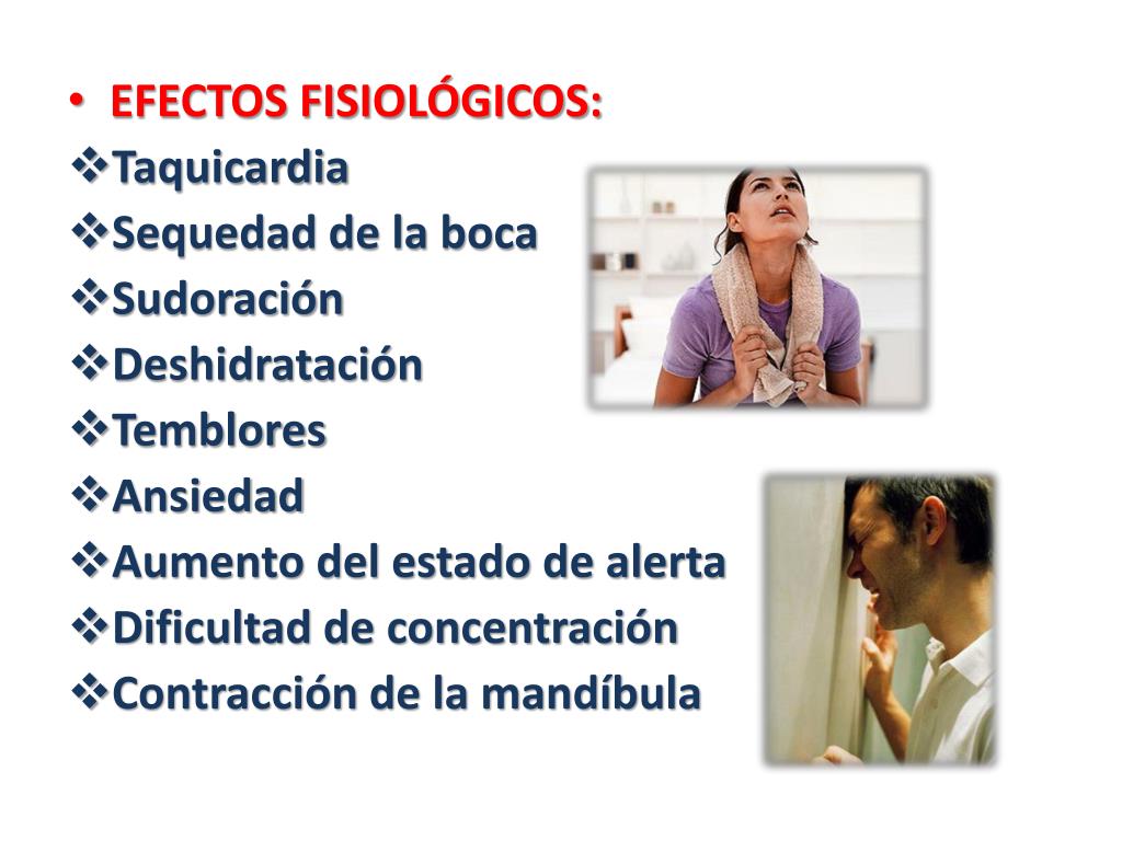 EFECTOS FISIOLÓGICOS: • Taquicardia • Sequedad de la boca • Sudoración • Deshidratación • Temblores • Ansiedad • Aumento del estado de alerta • Dificultad de concentración • Contracción de la mandíbula