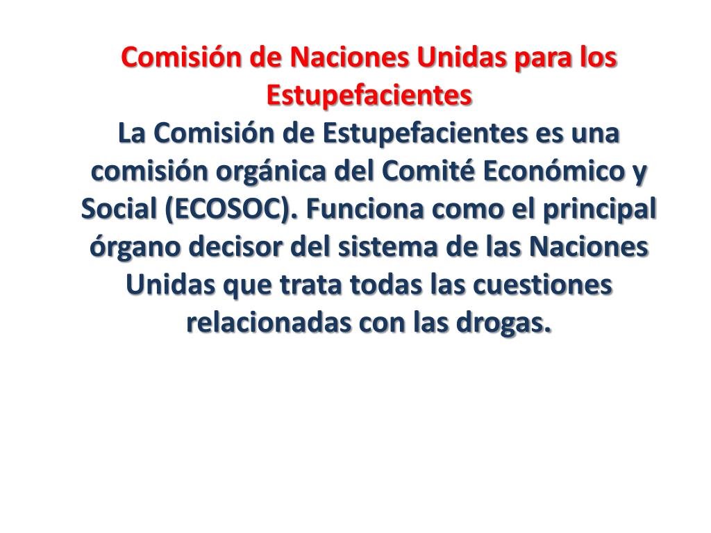Comisión de Naciones Unidas para los EstupefacientesLa Comisión de Estupefacientes es una comisión orgánica del Comité Económico y Social (ECOSOC). Funciona como el principal órgano decisor del sistema de las Naciones Unidas que trata todas las cuestiones relacionadas con las drogas.
