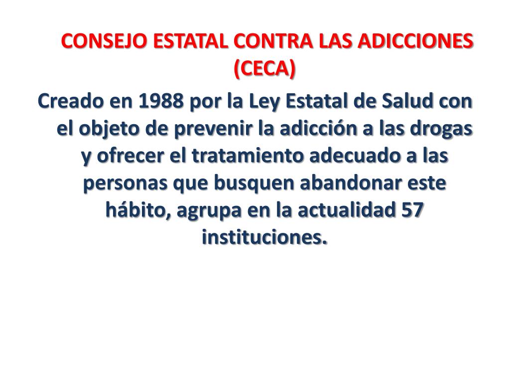 CONSEJO ESTATAL CONTRA LAS ADICCIONES (CECA) Creado en 1988 por la Ley Estatal de Salud con el objeto de prevenir la adicción a las drogas y ofrecer el tratamiento adecuado a las personas que busquen abandonar este hábito, agrupa en la actualidad 57 instituciones.