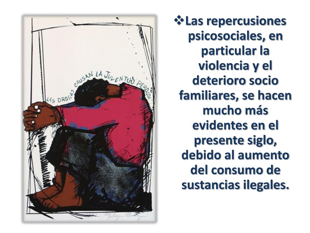 Las repercusiones psicosociales, en particular la violencia y el deterioro socio familiares, se hacen mucho más evidentes en el presente siglo, debido al aumento del consumo de sustancias ilegales.