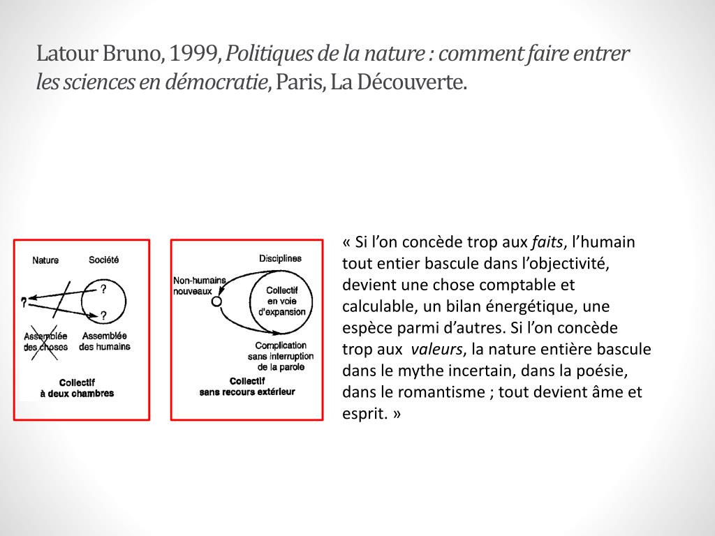 Latour Bruno, 1999, Politiques de la nature : comment faire entrer les sciences en démocratie, Paris, La Découverte. « Si l’on concède trop aux faits, l’humain tout entier bascule dans l’objectivité, devient une chose comptable et calculable, un bilan énergétique, une espèce parmi d’autres. Si l’on concède trop aux valeurs, la nature entière bascule dans le mythe incertain, dans la poésie, dans le romantisme ; tout devient âme et esprit.»