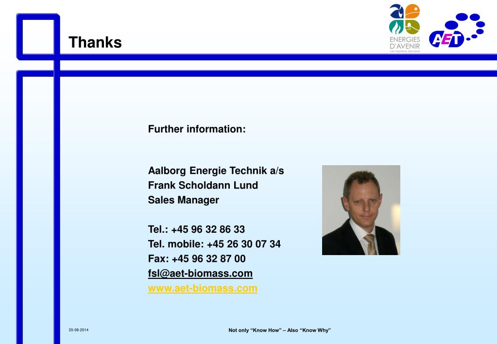Thanks • Further information: • Aalborg Energie Technik a/s • Frank Scholdann Lund • Sales Manager • Tel.: +45 96 32 86 33 • Tel. mobile: +45 26 30 07 34 • Fax: +45 96 32 87 00 • fsl@aet-biomass.com • www.aet-biomass.com Not only “Know How” – Also “Know Why”
